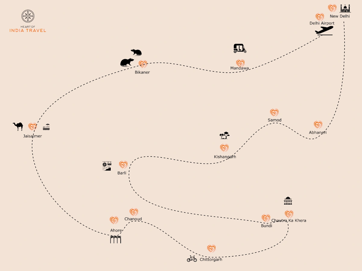 Duik in de betoverende wereld van Rajasthan, waar rijke geschiedenis, kleurrijke cultuur en adembenemende landschappen samenkomen. Deze 24-daagse reis neemt je mee van de serene woestijnen van Jaisalmer naar de majestueuze forten van Chittorgarh. Ontdek authentieke dorpen zoals Ajabgarh en Barli, geniet van schilderachtige routes die door prachtige landschappen slingeren, en ervaar de warme gastvrijheid van de Rajput-cultuur. Deze reis is speciaal ontworpen voor de ervaren reiziger die de gebaande paden van India al heeft gezien en op zoek is naar meer diepgang in hun ontdekking van dit fascinerende land.