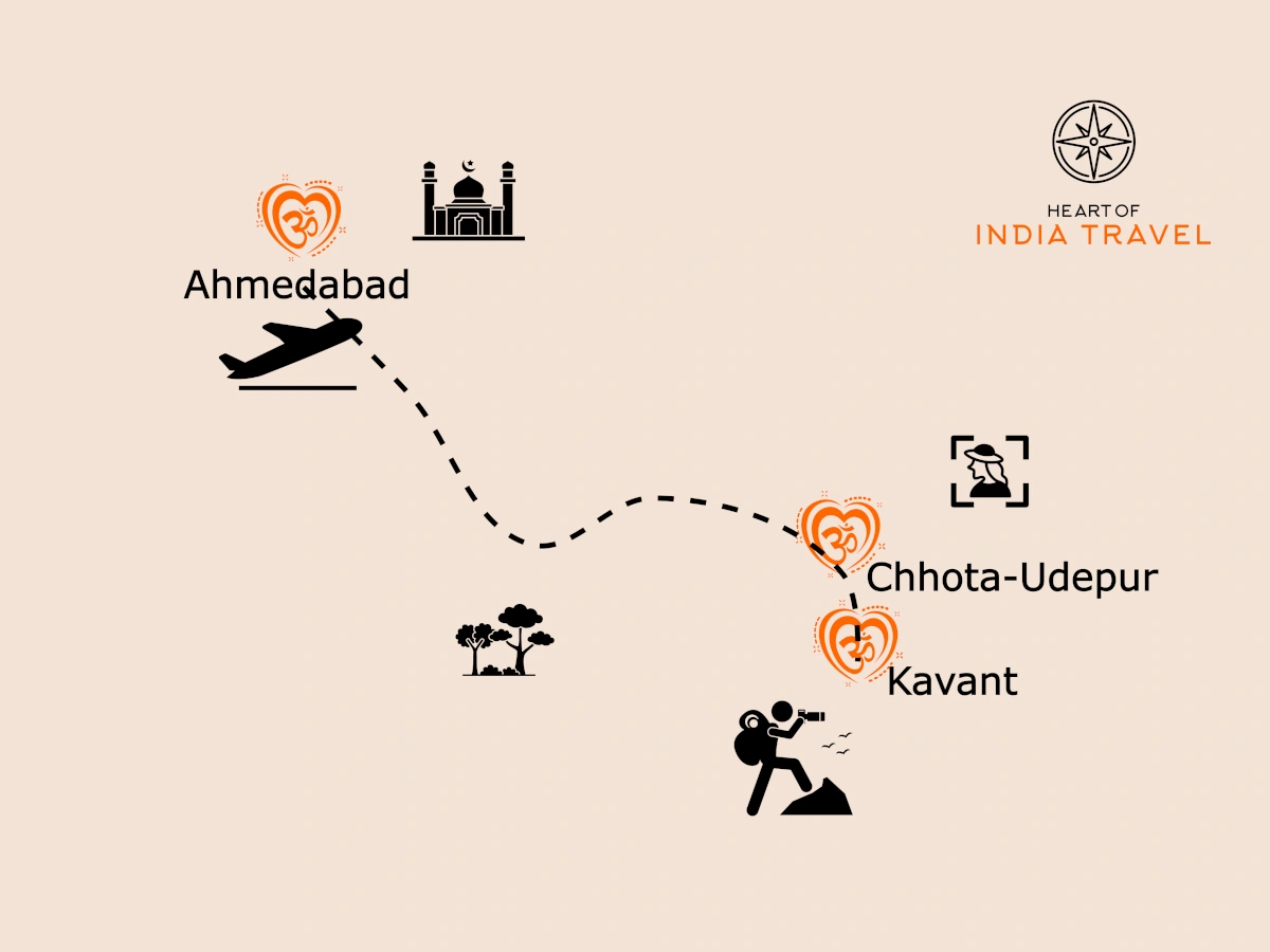 Na het ontbijt vertrek je vanuit Ahmedabad naar Chhota Udepur, gelegen in een tribale regio met beperkte toeristische infrastructuur. Je verblijft in een eenvoudig, maar net hotel dat een schone en authentieke ervaring biedt. In de middag heb je tijd om te ontspannen, contact te maken met je medereizigers en te wennen aan het reisschema. Je neemt deel aan een informatiesessie met Parvez en Nicole over de focus, aanpak en praktische tips van de reis, inclusief antwoorden op veelgestelde vragen.