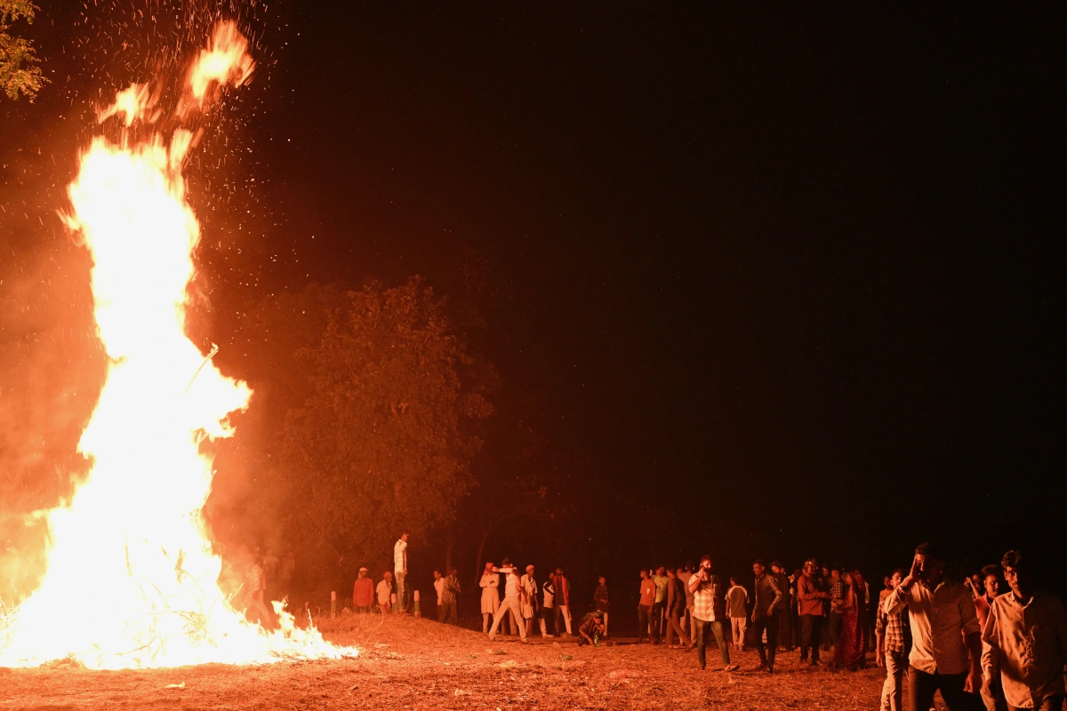 ’s Avonds beleef je een intieme Holi-viering met de Rathwa-gemeenschap: eeuwenoude rituelen zoals blootsvoets over gloeiende kolen lopen, rituele dansen, tribale muziek en lokale dranken — een krachtig en authentiek moment, ver weg van toeristische festiviteiten.