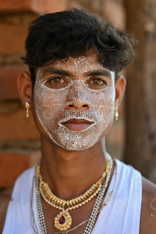 Deze ochtend bezoek je een levendige dorpsmarkt waar lokale mannen zich voorbereiden op het Kavant Festival, omringd door tribale ambachten, traditionele goederen en feestelijke energie. ‘s Avonds woon je Holika Dahan bij, het symbolische vreugdevuur dat het begin van Holi markeert. Rathwa dorpelingen verzamelen zich in ceremoniële kleding, zingen en trommelen terwijl ze houtstapels aansteken en graan en bloemen offeren voor zegeningen. Kijk hoe mannen ceremoniële schmink aanbrengen, ter voorbereiding op de heilige festiviteiten die gaan komen. Een krachtig en zeldzaam kijkje in Holi door de ogen van de Rathwa-stam.