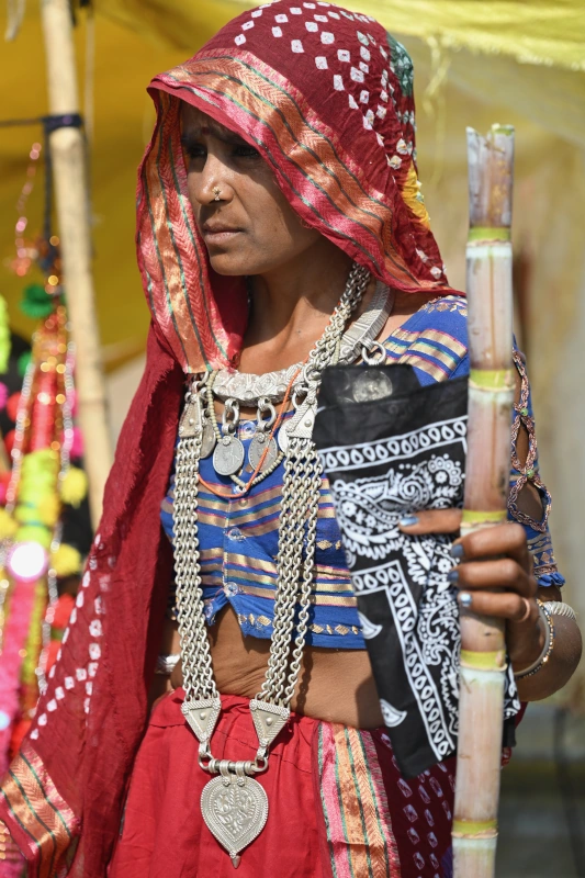 Vroeg in de ochtend rijd je naar Kavant om het levendige en emotionele Kavant Festival mee te maken. Een viering van overgangen, familierelaties en een succesvolle oogst, uitgedrukt in kleur, muziek en dans. Onderweg zie je groepen stamleden die zich te voet of met gedeeld vervoer naar het festival begeven, gekleed in opvallende traditionele kleding. Vrouwen uit elk dorp dragen bijpassende dupatta’s en rokken, terwijl mannen bijpassende tulbanden en rokken dragen. Elke subgroep drukt zo haar identiteit uit. Mannen en vrouwen zijn versierd met gedurfde zilveren sieraden en dragen accessoires zoals zonnebrillen, aanstekers en radio’s een unieke visuele ervaring die de geest en trots van de Rathwa-gemeenschap weerspiegelt.