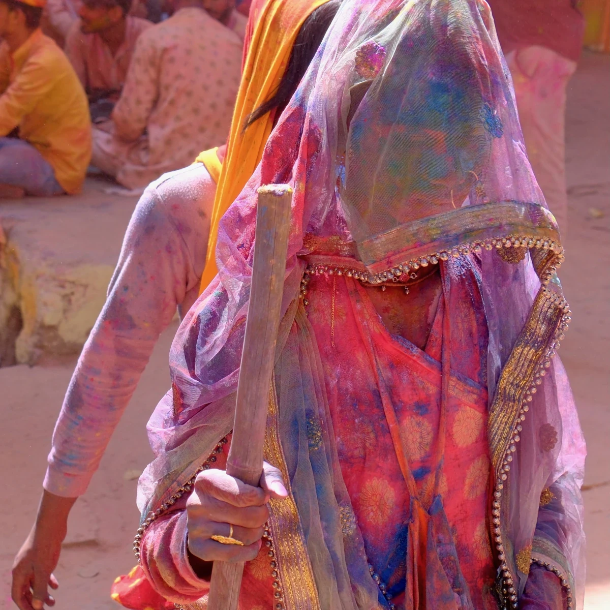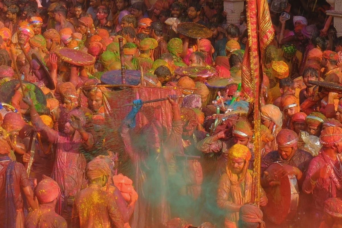 Vandaag vindt Latmar Holi plaats in Nandgaon, waar nu de vrouwen uit Nandgaon speels de mannen uit Barsana met stokken slaan.